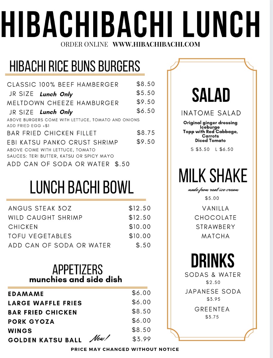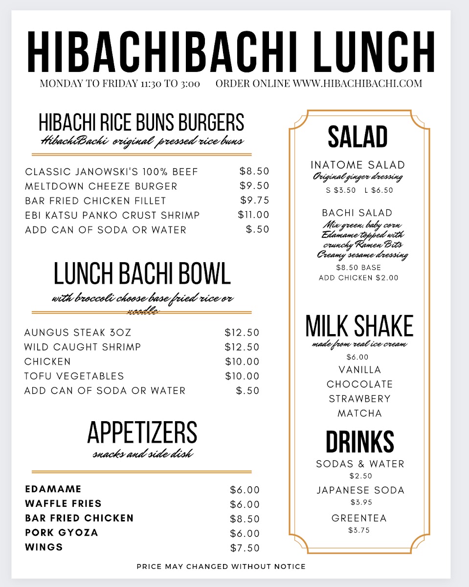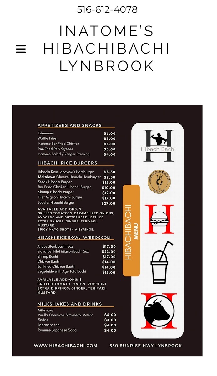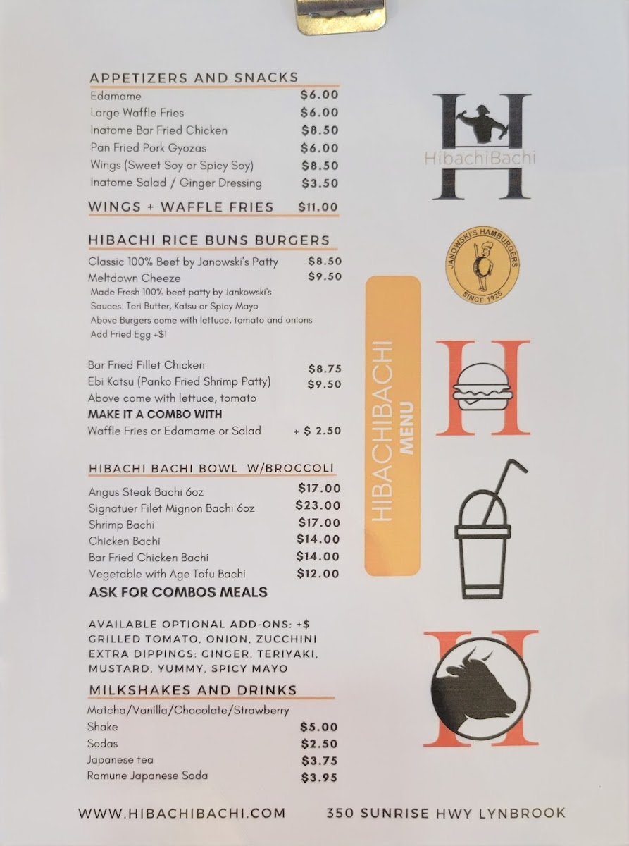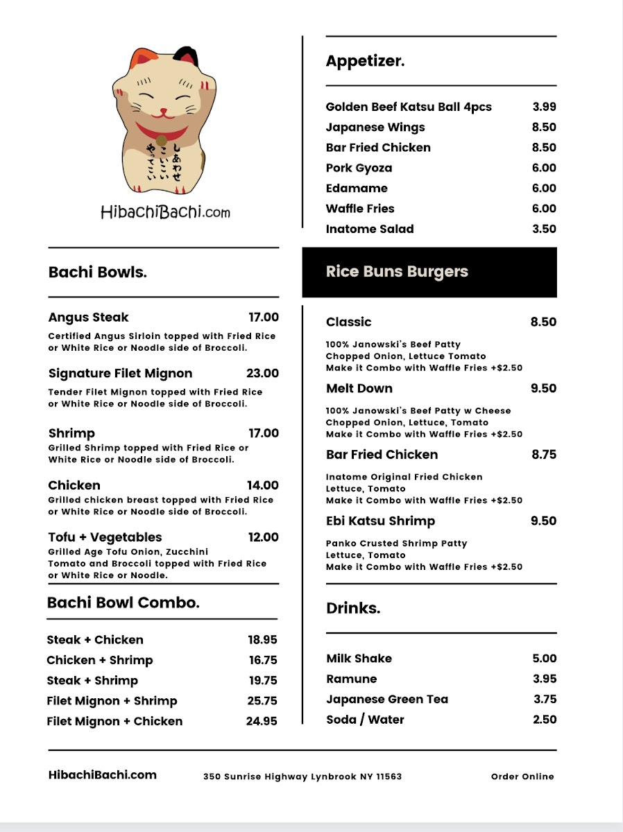 Inatome's Hibachibachi in Lynbrook offers a diverse and satisfying menu that caters to a variety of tastes. The Lunch Bachi Bowls are a great deal, with options like Lunch Shrimp Bachi, Lunch Veg Bachi, and Lunch Steak Bachi each priced reasonably for a quick, flavorful meal. For something heartier, the Bachi Burger Combos, including the Bar Fried Fillet Chicken Sandwich Combo and Melt Down Burger Combo, provide a fusion of hibachi flavors in a sandwich. The restaurant's signature Bachi Noodle and Bachi Bowls, such as the Lobster Tail Bachi Bowl and Signature Filet Mignon Bachi Bowl, are highlights, featuring fresh ingredients cooked to perfection. The Bachi Bowl Combo options, like Chicken & Steak or Filet Mignon & Shrimp, offer variety at an affordable price. For an appetizer, the Bachi Dog, Pork Gyoza, and Bar Fried Shrimp are popular choices that bring extra flavor to the table. If you're in the mood for something more indulgent, the Party Trays, like the 25 Wings + 4 Free Katsu Balls or Party Waffle Fries, are perfect for sharing. The drink menu also features refreshing options such as Strawberry Acai Lemonade and Frozen Pina Colada. Whether you're craving a quick bite or a full meal, Inatome's Hibachibachi has something to satisfy every palate.